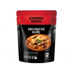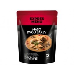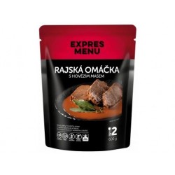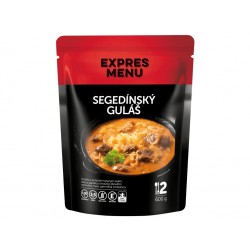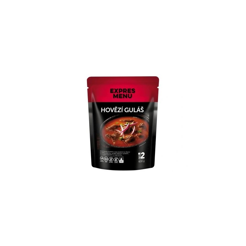 hovězí maso přední (31 %), hovězí vývar (voda, hovězí maso a kosti), cibule, rýžová mouka, česnek, kukuřičná mouka, řepkový olej, rajčatový protlak (voda, rajčatový protlak, sůl), paprika mletá, sůl kamenná, majoránka, kmín, pepř.