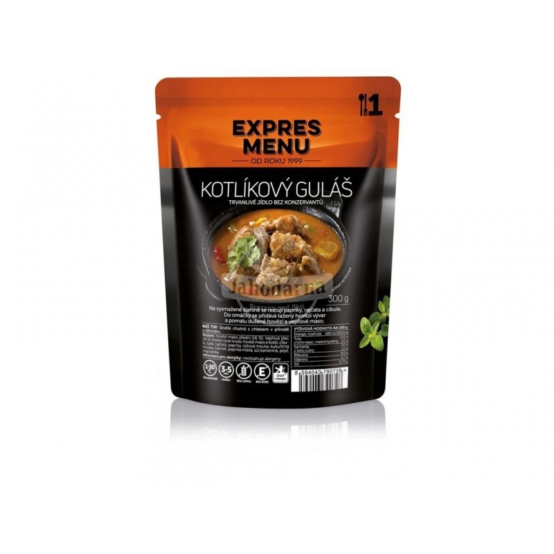 hovězí maso přední (16 %), vepřová plec (16 %), hovězí vývar (voda, hovězí maso a kosti), cibule, špek, rajčata, papriky, rýžová mouka, kukuřičná mouka, česnek, paprika mletá, sůl kamenná, pepř, majoránka.