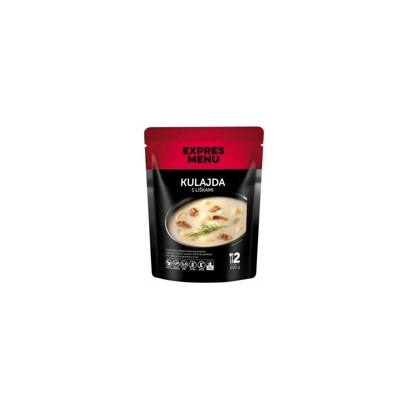 voda, brambory, smetana, vejce, houby lišky obecné (3 %), cukr, ocet, rýžová mouka, kukuřičná mouka, kopr sterilovaný (voda, kopr, ocet kvasný, cukr, sůl), sůl kamenná, pepř.