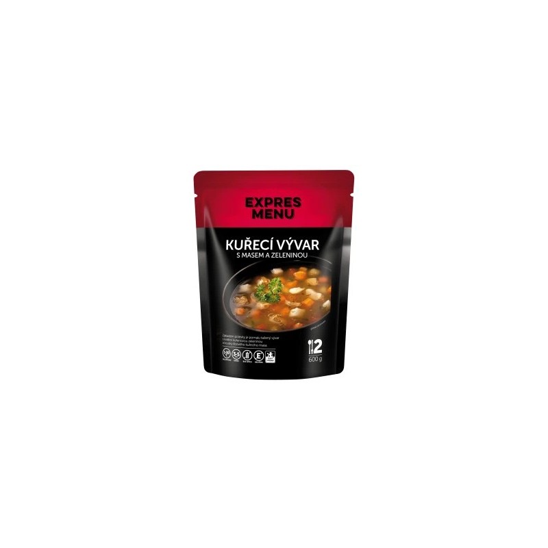 kuřecí vývar (voda, kuřecí maso a kosti, cibule, česnek, bobkový list, nové koření, pepř, sůl), směs zeleniny (mrkev, celer, petržel) (23 %), kuřecí maso (5 %), sůl kamenná, pepř.