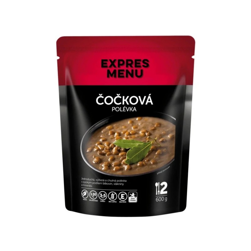 voda, čočka (23 %), řepkový olej, čočková mouka, cibule, česnek, sůl kamenná, majoránka, pepř.